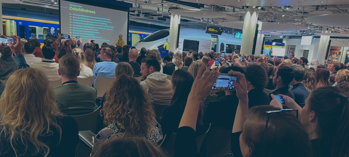 Last Friday we met with more than 300 other UX/UI designers for the first Dutch Enterprise UX conference in Utrecht - a conference about designing software for professionals. And that in a beautiful hall at NS. Yes, there was a real train, a station clock and the live sign with arrival times. A trip report by Joëlle van Schaaik and Carla Huls.